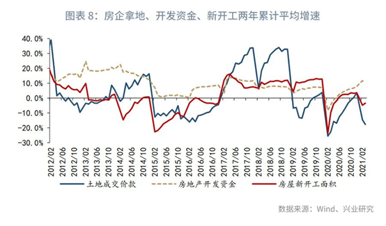 2021年3月基建投资(全口径)两年累计平均增速录得5.8%,表现不俗。但是从2020年的表现来看,基建投资在专项债、财政支出放量时,往往出现短期走强,后续又随着资金动能的走弱而走弱。本月基建投资的回升部分由于1-2月份需求的后移。全年来看,在政府去杠杆的目标下,基建投资预计相对稳定。
