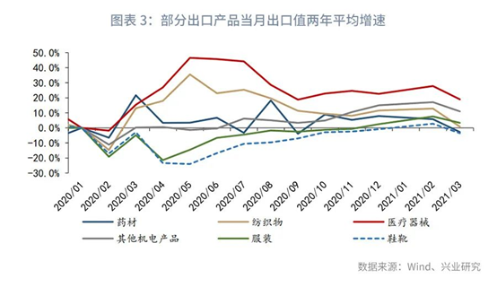 出口方面,2020年以来防疫物资、宅经济物资强劲表现带动出口高增,但鞋帽、服装等传统出口品表现低迷;