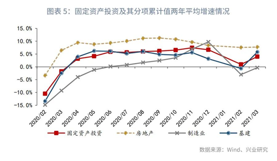 2021年3月固定资产投资累计同比25.6%,两年平均增长2.9%。其中,房地产、基建投资两年平均累计增速为7.6%和5.8%,而制造业投资则由-3.0%升至-0.4%,既有税收政策调整影响,亦有部分行业恢复动力不足的因素。