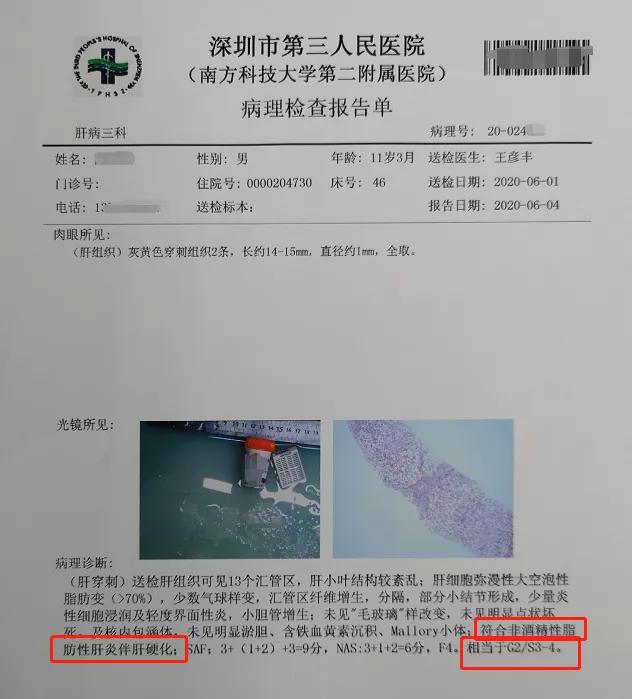 3天后肝穿结果出来了,验证了医生不详的预感。小男孩的病理报告显示:非酒精性脂肪性肝炎伴肝硬化,肝硬化等级是S3-4,属于重度肝硬化。