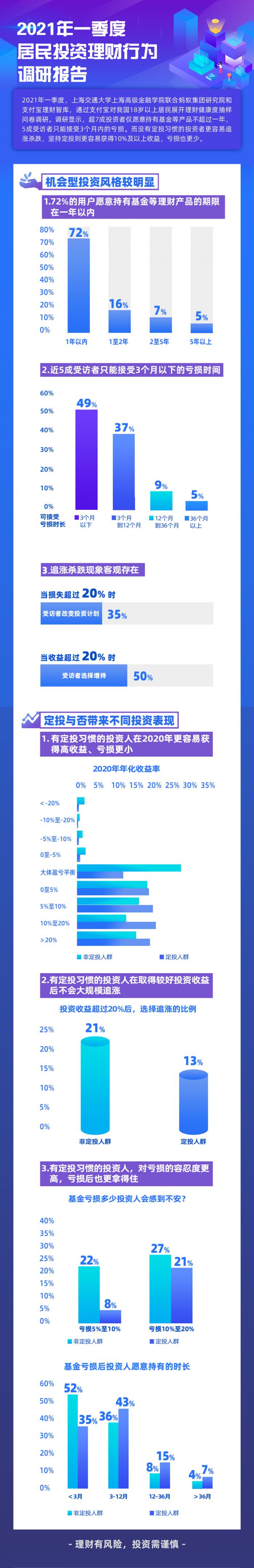 4月20日,上海交通大学上海高级金融学院联合蚂蚁研究院、支付宝理财智库发布2021年一季度《居民投资理财行为调研报告》。调研结果显示,超7成投资者愿意持有基金等理财产品的周期短于一年,近一半受访者能接受3个月以内的亏损。没有定投习惯的受访者更容易追涨杀跌,坚持定投则更容易获得10%及以上收益,亏损也更少。