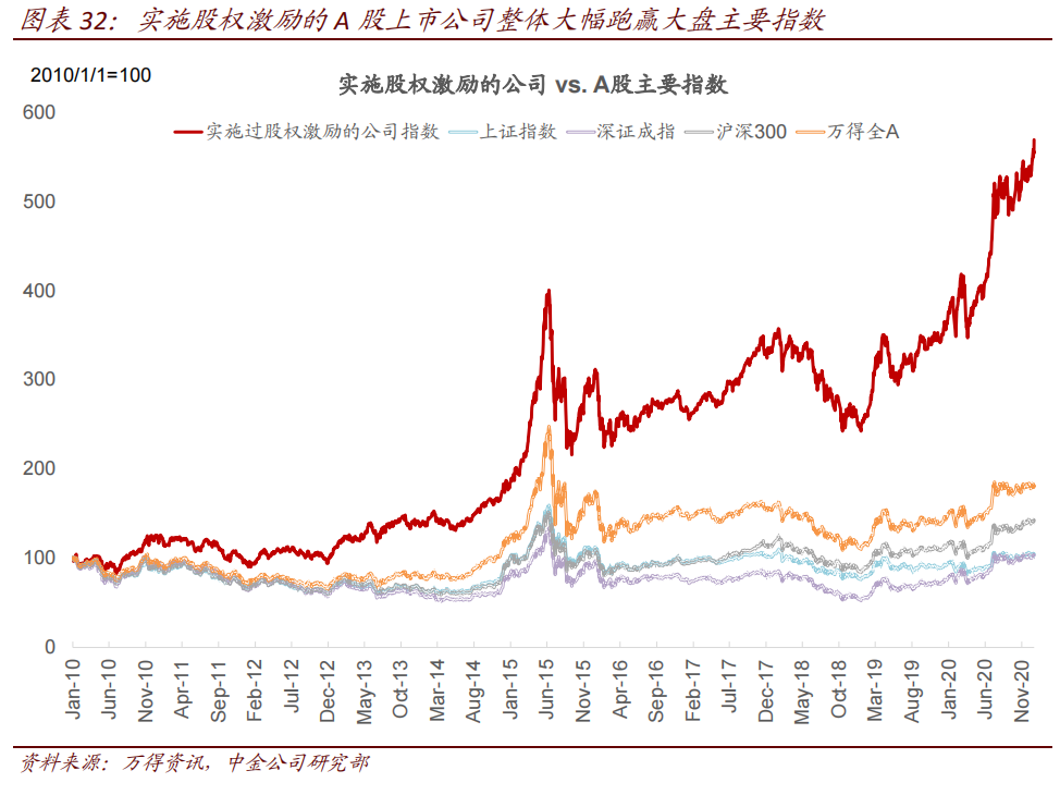 根据中金公司报告,从 2010 年至今股权激励指数跑赢上证指数 510 个百分点,跑赢深证 成指 520 个百分点,以及跑赢沪深 300 和万得全 A 指数 380 个百分点和 290 个百分点。