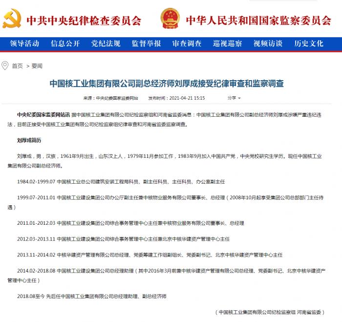 据中国核工业集团有限公司纪检监察组和河南省监委消息:中国核工业集团有限公司副总经济师刘厚成涉嫌严重违纪违法,目前正接受中国核工业集团有限公司纪检监察组纪律审查和河南省监委监察调查。
