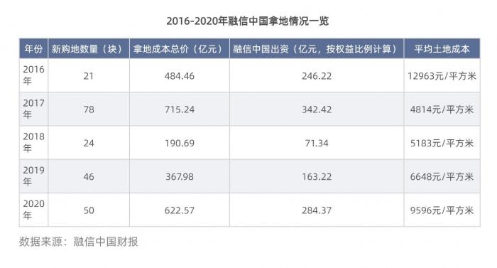 随后2018 年融信的拿地节奏放缓,投入71.34亿(权益口径)拿地新收购地块24块。近两年拿地节奏又有所恢复,2019年、2020年分别耗资(权益口径)163.22亿、284.37亿购地46块、50块。并且去年拿地成本并不低,平均土地成本达9596元,相比前一年增加44.3%。