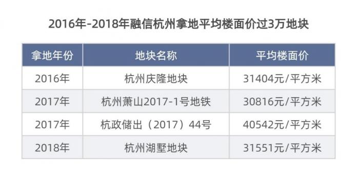 以杭州为例,南财智库-21资管研究院根据年报数据统计发现,2016年-2018年期间,融信在杭州拿地平均楼面价超过3万/平方米的高价地有4块,其中一块地成本价超过4万,还有不少平均楼面价2-3万的地块。而从2020年交付数据来看,去年杭州楼盘的平均售价为29844元/平方米。