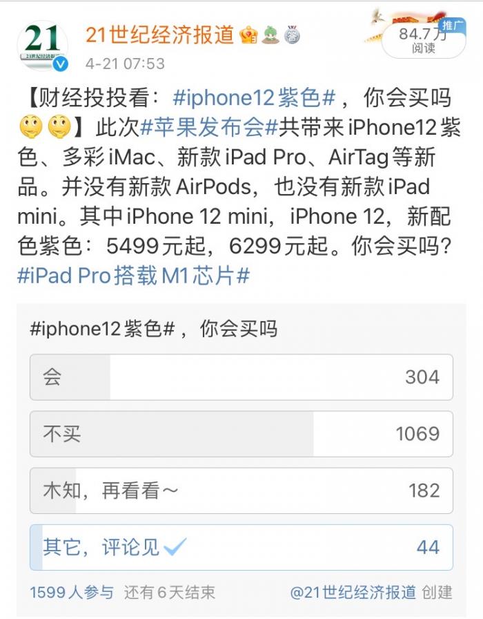 对苹果发布会不满的,还有广大网友。发布会结束后,苹果相关话题纷纷登上微博热搜。其中,话题#iPhone12紫色#和#AirTag#的讨论量均超10万。21网调实验室调查发现,在iPhone 12的新配色和新品AirTag防丢器上,网友争议巨大。
