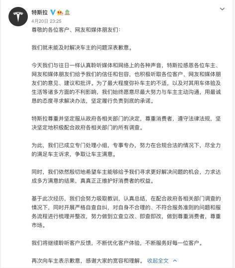 4月20号23点25分,特斯拉官方微博发长文致歉,一改之前的强硬态度,言辞委婉,语气谦和,并希望维权的车主能够给特斯拉解决问题的机会。