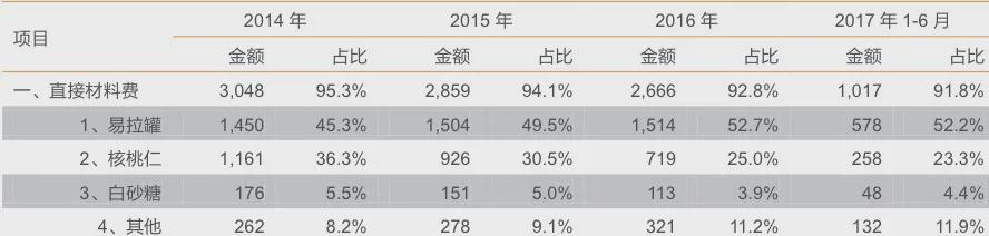 对于核桃乳产品来说,向上游采购的主要原材料为核桃仁。2017年上半年核桃仁的原料采购占到了养元自产产品成本的23%;养元饮品的包装材料主要为铁质易拉罐,2017年上半年占自产产品成本的52%;白砂糖2017年上半年占自产产品成本的4.4%。