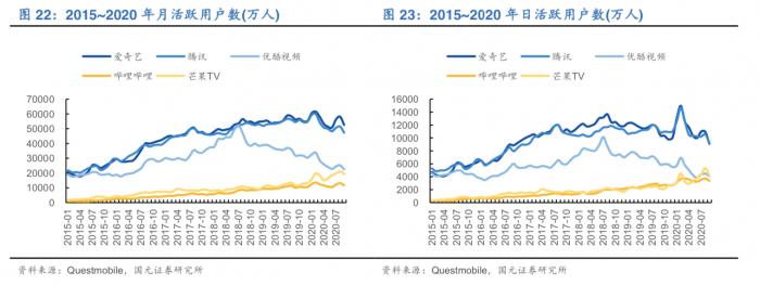 在对盈利更为重要的付费会员数上,头部平台增速放缓,二梯队平台仍处增量阶段。据财报,爱奇艺及腾讯视频付费会员数分别于 2019Q2、Q3 突破 1 亿,但随后爱奇艺付费会员数增速放缓,2020 Q4 为 1.02 亿,环比下滑 3%,同比下滑 5%;腾讯视频付费会员数于 2020Q2 超越 爱奇艺,2020Q4 达到 1.23 亿,环比增长 2%,同比增长 16%。目前,第二梯队的芒果 TV 和哔哩哔哩付费会员数仍处高速增长期,芒果 TV 会员数于 2019 年突破 1800 万人,同比增长67%,2020 年末达 3613 万,同比增长高达 96.68%;哔哩哔哩付费会员数保持翻倍增长,二者在增量市场还有较大上行空间。