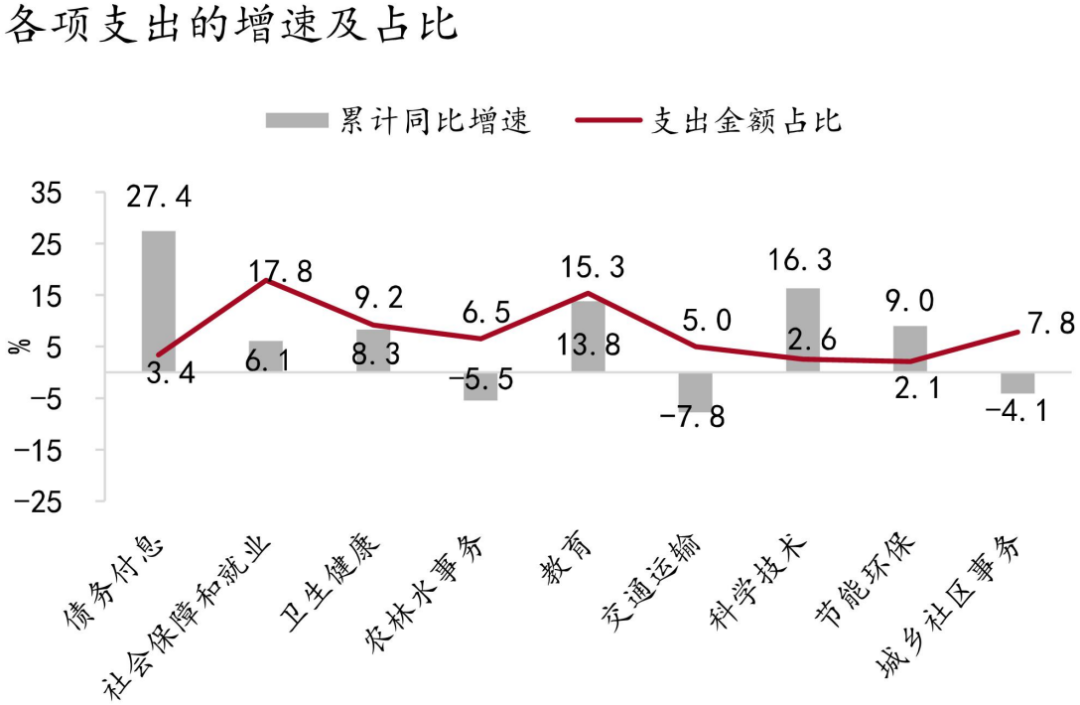 基建领域支出增速依然低迷。交通运输、节能环保、城乡社区事务、农林水事务领域的支出两年年均复合增长率分别为-12.3%、-3.8%、-14.4%和-4.5%,环比变动为+4.5pct、-6.7%、-9.5pct、-5.7%。