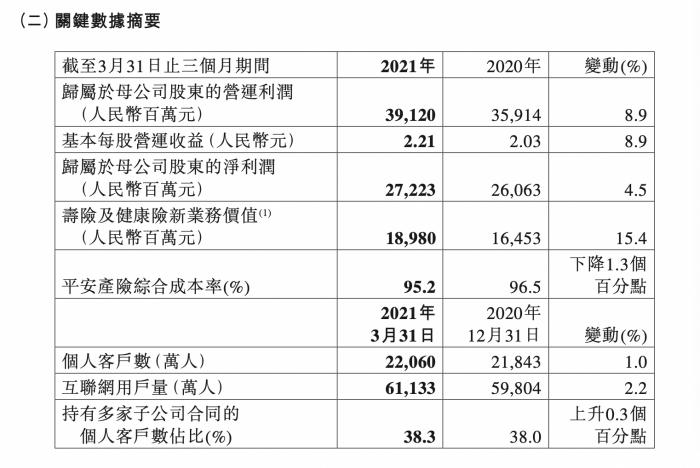 一季报数据显示,2021年第一季度,公司归属于母公司股东的净利润272.23亿元,同比增长4.5%;归属于母公司股东的营运利润同比增长8.9%至391.20亿元;基本每股营运收益为2.21元,同比增长8.9%;年化营运ROE达20.0%。
