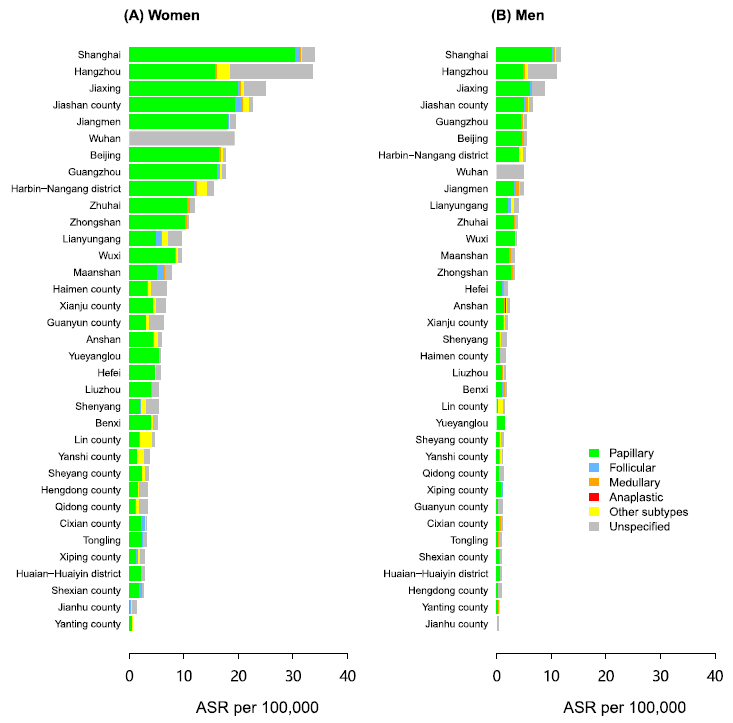 ▲不同地区15-84岁女性(A)和男性(B)甲状腺癌的年龄标准化发病率。绿色-乳头状癌;蓝色-滤泡状癌;橙色-髓样癌;红色-未分化型癌;黄色-其他亚型;灰色-未区分。(图片来源:参考资料[1])