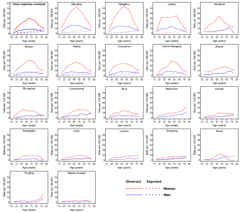在年龄标准化发病率高的城市地区以及上海和杭州等大城市中,这种现象尤为明显,但在农村登记处中没有观察到这一现象,除了嘉善县。大量女性在30-49岁期间被诊断出甲状腺癌,可能是因为妇科和产科健康需求,让女性有更多就诊机会。