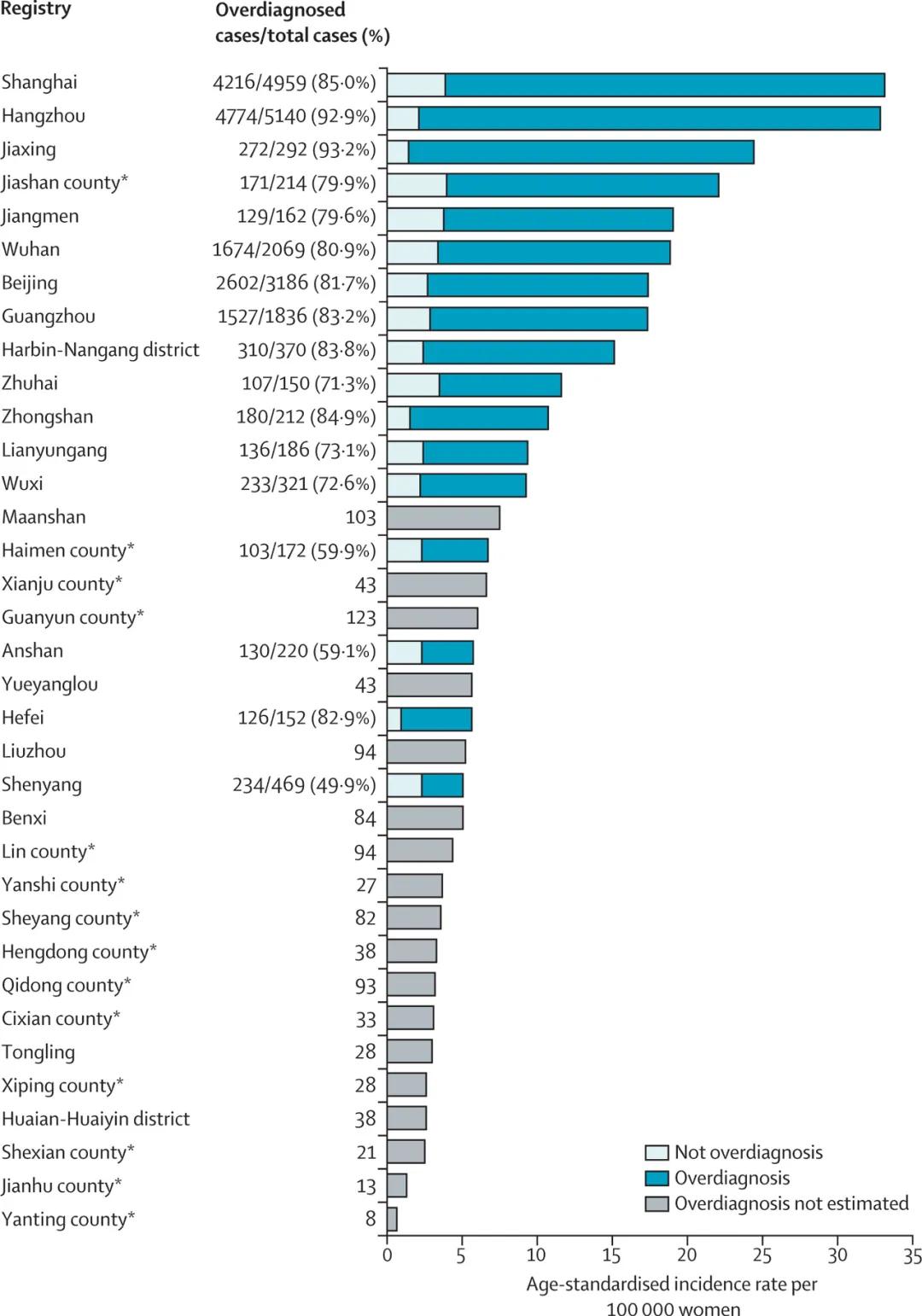 世界卫生组织下属国际癌症研究机构(IARC)在2020年发表的一项研究显示,在一些国家中,甲状腺癌病例中多达60%-90%是因过度诊断而发现的。过度诊断的现象也可能正在影响中国。在2003-2011年期间,中国甲状腺癌病例每年平均增长20%,但各地区之间并不均衡。
