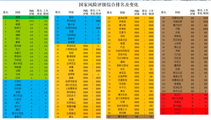 本次的评级结果部分为9级,其中 AAA和 AA为低风险级别,包括18个国家,排名前10的分别是德国、瑞士、韩国、新西兰、丹麦、瑞典、荷兰、挪威、新加坡和芬兰。A和BBB为中等风险国家,包括68个国家;其他的为高风险级别,包括28个国家。
