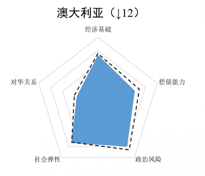 报告显示,德国是总排名中风险最低、评级最高的国家。在中国企业对外直接投资的前 10大目的地中,澳大利亚、美国和英国等排名下降较多,尤其是澳大利亚,偿债能力和对华关系得分下降明显,导致其总排名下降了 12位。