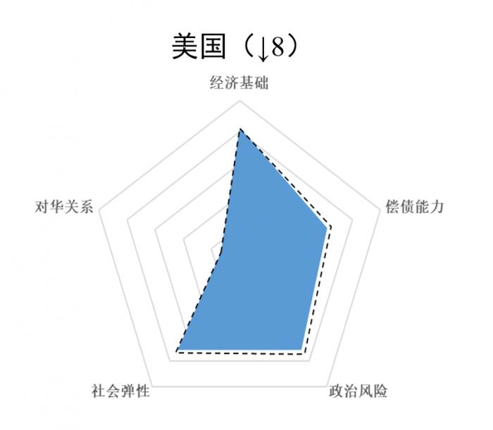 美国2021的评级排名也较2020年下降了8位,报告认为,美国的政治风险和偿债能力指标下降是主要原因。