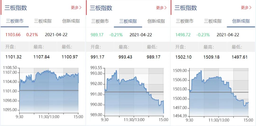 截至4月22日收盘,三板做市报1103.66点,上涨0.21%;三板成指报989.17点,下跌0.21%;三板创新报1498.72点,下跌0.23%。
