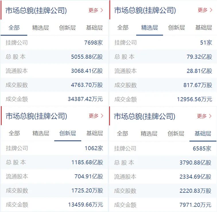 截至4月22日收盘,今日成交金额为3.44亿元,精选层成交金额为1.30亿元,创新层成交金额为1.35亿元,基础层成交金额为0.80亿元;今日成交股数为4763.70万股,精选层成交股数为817.67万股,创新层成交股数为1725.20万股,基础层成交股数为2220.83万股。