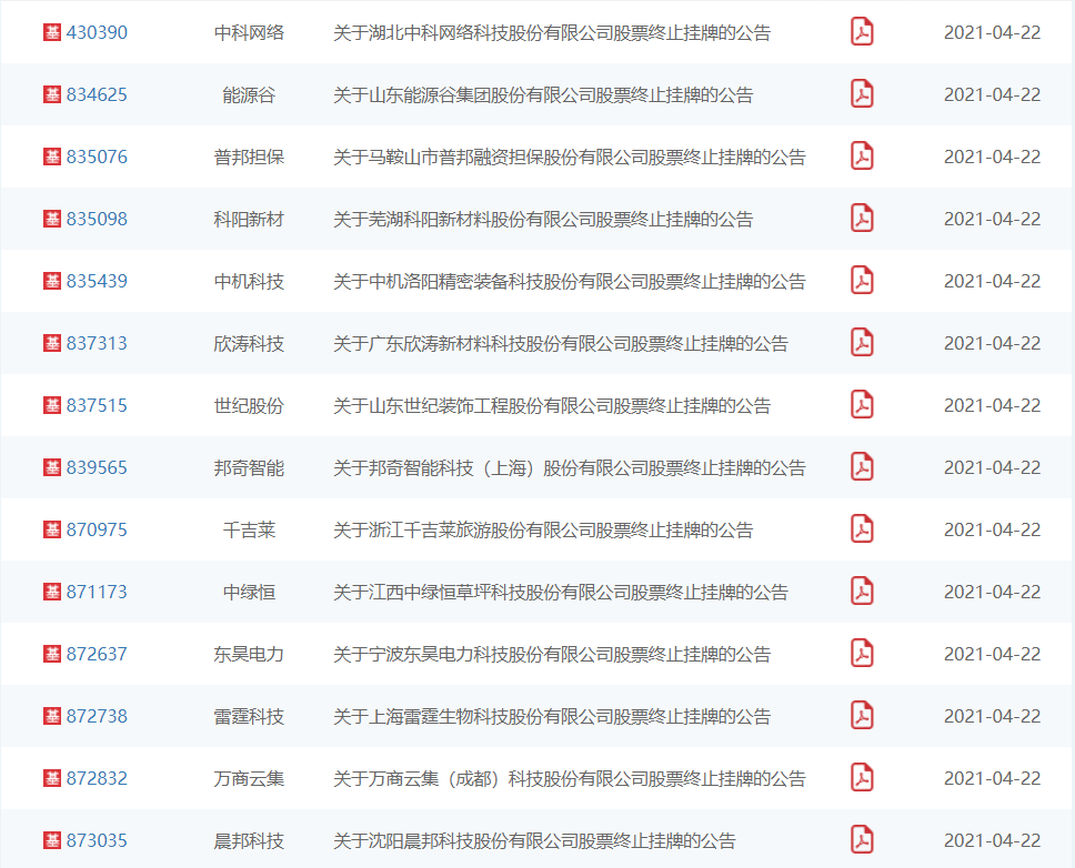 4月22日,全国股转公司公告,新三板基础层公司中科网络、能源谷、普邦担保等14家公司终止挂牌。