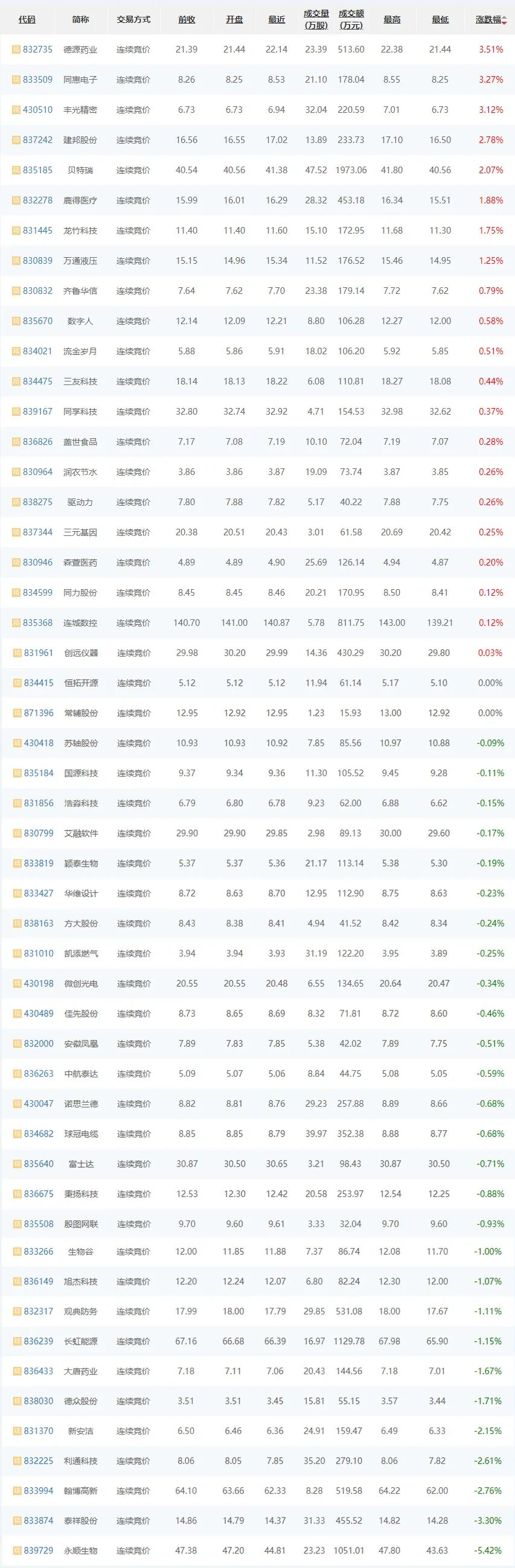 4月22日,精选层涨跌互现,21家企业上涨,2家平盘,28家下跌。其中,德源药业(832735)涨幅居首,上涨3.51%;其次,同惠电子(833509)上涨3.27%;永顺生物(839729)下跌5.42%,跌幅居首;泰祥股份(833874)下跌3.30%居次;恒拓开源(834415)、常辅股份(871396)平盘。