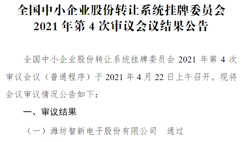 4月22日,全国股转网站显示,在今日召开的精选层2021年第4次审议会议上,智新电子(837212)过会。成为今年第3家精选层过会企业。