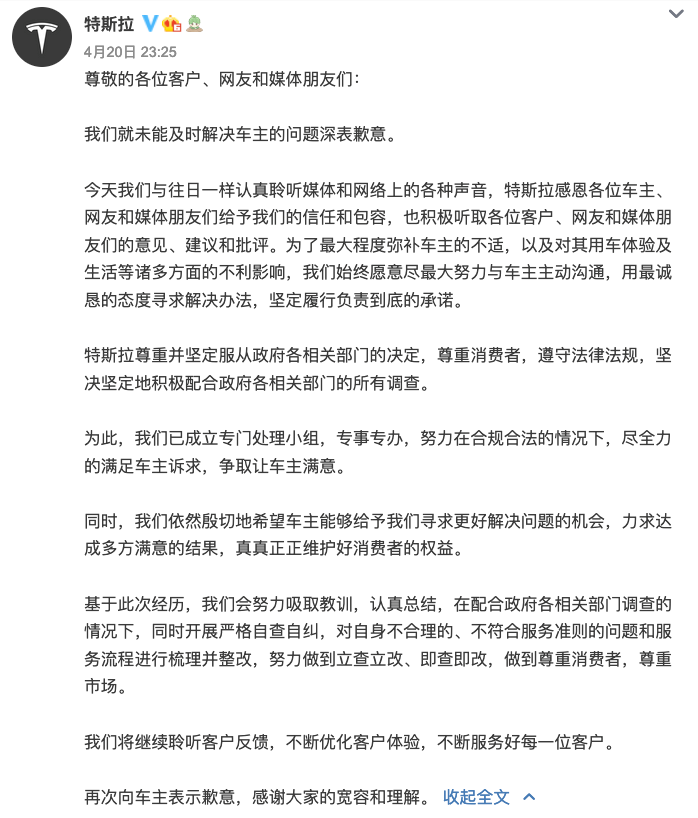 特斯拉第二份声明发布之前,4月21日下午,维权车主张女士的丈夫接受腾讯《棱镜》专访时表示,事件发生后,并没有特斯拉工作人员与他们联系,“特斯拉不是在向他们道歉”。