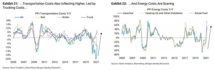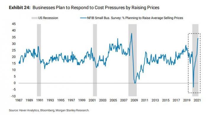 下图显示,中小型企业涨价计划的调查指数,飙升至接近历史高位的水平。