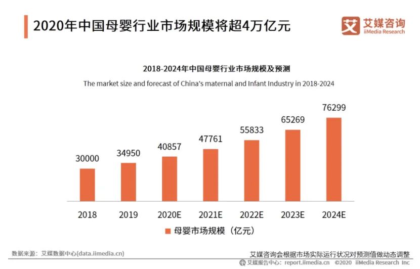 数据显示,2020年中国母婴市场规模突破1000亿美元,中国市场的电商占比从2019年的26.3%提升至32.7%。2020年共有243个品牌在天猫销售额破亿,其中天猫母婴亲子行业新增33个过亿品牌,包括5个破亿新锐品牌。