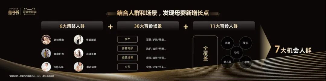 具体来讲,不同年龄的宝宝有不同需求,在婴童食品方面,婴儿阶段、幼儿阶段、学前阶段等对应不同阶段的宝宝主食、零食和鲜食;专业细分即根据宝宝成长阶段,进行精准科学匹配以适应宝宝的早教阶段和进阶阶段;新品升级主要通过与头部商家战略合作,打造新爆款拓展新品类,如天猫首发的IP文创及潮玩类,为多元化市场拓展了无限可能;场景丰富则需要洞察营养喂养、潮童潮范、玩乐学习、出行运动等亲子场景,打造新的内容,带来新的增量。