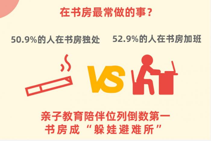 书房的功能和价值也愈发多样化。调研显示,在书房用途功能上,除了阅读,书房也被人们用于工作加班、独处、看影视、会客聊天和健身锻炼等。高达52.9%的人把书房作为加班工作的场所,50.9%的人更愿意在书房独处“静静”。在书房陪孩子阅读、玩耍的比例倒数第一,多数人把书房作为暂避小憩的场所。