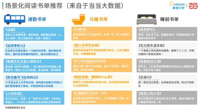 报告数据显示,通勤、马桶、睡前、午休、早起和就餐时正在成为人们的“第二书房”,其中,63.6%的人在通勤路上看书,39.5%的人在马桶上看书,35.4%的人在睡前看书。除此之外,午睡时、早起时、就餐时也成为比较常见的碎片化阅读场景。