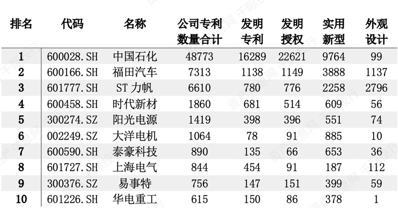 对国内氢能源产业的各个专利申请人的专利数量进行统计,排名前十的氢能源公司依次为:中国石化、福田汽车、ST力帆、时代新材、阳光电源、大洋电机、泰豪科技、上海电气、易事特、华电重工等。
