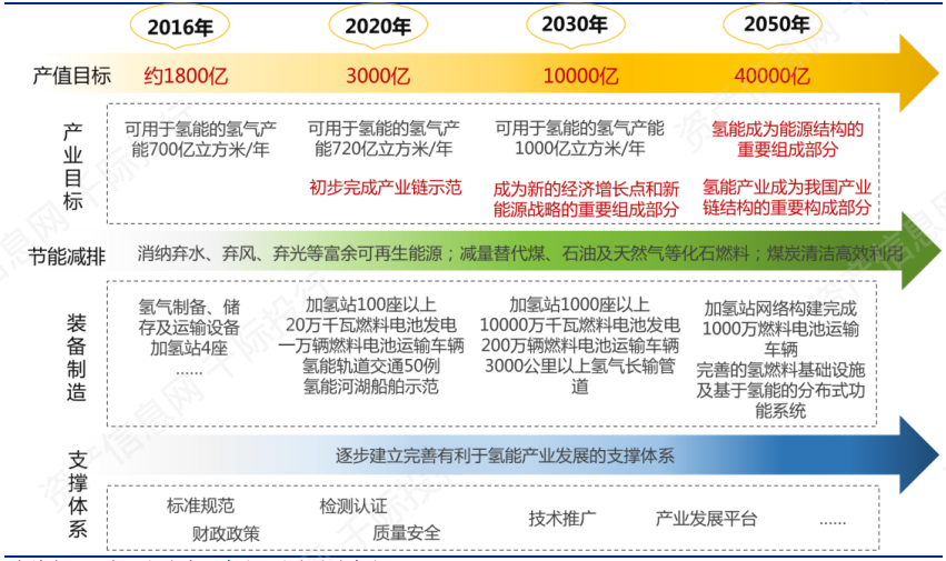 我国《“十三五”战略性新兴产业发展规划》、《能源技术革命创新行动计划(2016~2030年)》、《节能与新能源汽车产业发展规划(2012~2020年)》、《中国制造2025》等国家规划都明确了氢能产业的战略性地位,纷纷将发展氢能列为重点任务,将氢燃料电池汽车列为重点支持领域。
