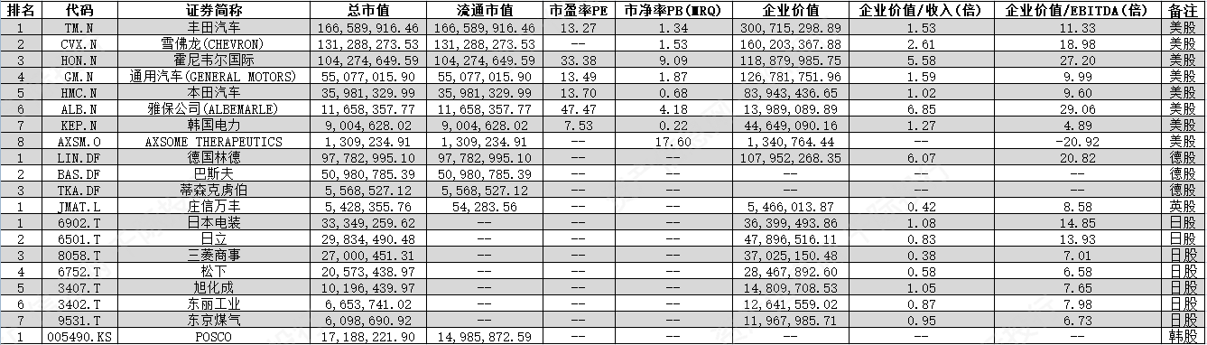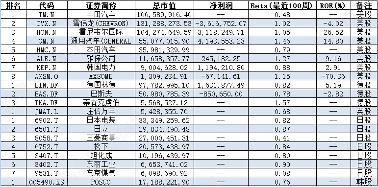 全球非中国主要企业有丰田汽车[TM.N]、雪佛龙(CHEVRON)[CVX.N]、霍尼韦尔国际[HON.N]、通用汽车(GENERALMOTORS)[GM.N]、本田汽车[HMC.N]、雅保公司(ALBEMARLE)[ALB.N]、韩国电力[KEP.N]、AXSOMETHERAPEUTICS[AXSM.O]、德国林德[LIN.DF]、巴斯夫[BAS.DF]、蒂森克虏伯[TKA.DF]、庄信万丰[JMAT.L]、日本电装[6902.T]、日立[6501.T]、三菱商事[8058.T]、松下[6752.T]、旭化成[3407.T]、东丽工业[3402.T]、东京煤气[9531.T]、POSCO[005490.KS]等。