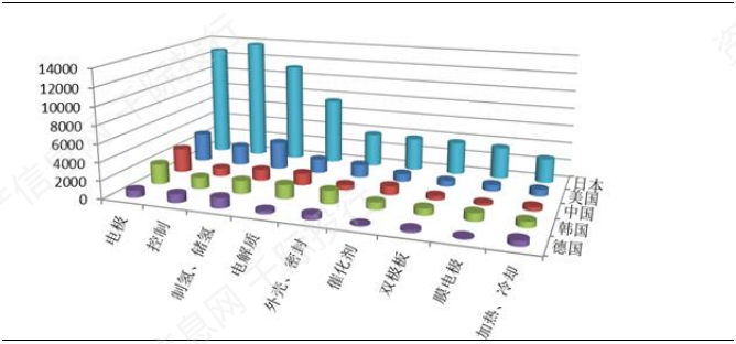 总体上看,日本、美国、中国、韩国和德国是燃料电池技术主要专利申请国,各关键技术发展比较均衡。日本作为全球专利排名第一的国家,在多个关键技术上均处于绝对领先地位,技术最为全面且没有明显的短板,且控制技术方面的领先优势最为明显。美国和韩国各关键技术发展比较均衡。中国比较重视电极和催化剂的研发,德国比较关注制氢、储氢以及燃料电池加热、冷却技术。