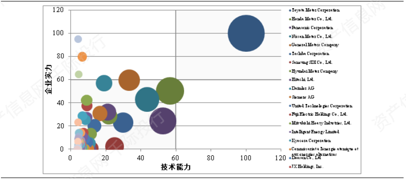 企业综合竞争力评估方面,根据Innograph专利分析平台提供的分析模型,综合考虑企业的专利数量、专利涉及分类数量、专利涉及地区数量、被引次数、营业收入、专利侵权情况等方面,燃料电池行业中,丰田汽车、本田汽车、松下、日产汽车、通用汽车、东芝、现代汽车、日立、戴姆勒、西门子等企业综合实力居前,而排名前十公司中,日本公司占据六席为主,反映日本企业综合竞争力较强。