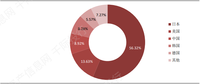 从优先权专利申请的国家分布情况来看,燃料电池专利技术主要集中在日本、美国、中国、韩国和德国。其中,日本优先权专利数量达到66971个(占56%),处于绝对领先地位,而中国以9%的份额排名第三。