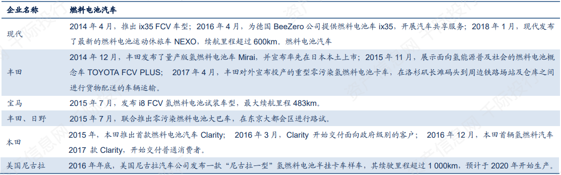 表 国外燃料电池汽车企业及其燃料电池汽车
