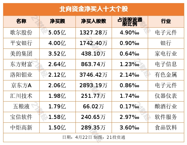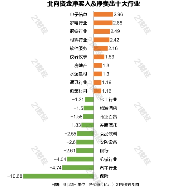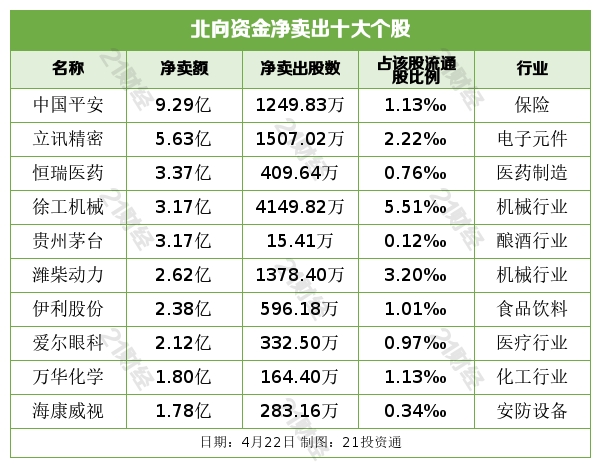 据21投资通(微信号ID:touzit21)智能监测,4月22日,北向资金净卖出15.97亿元,其中沪股通净卖出21.84亿元,深股通净买入5.87亿元。