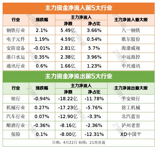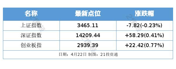 4月22日,大小股指分化,沪指跌0.23%,深证成指涨0.41%,创业板指涨0.77%。钢铁板块走强。
