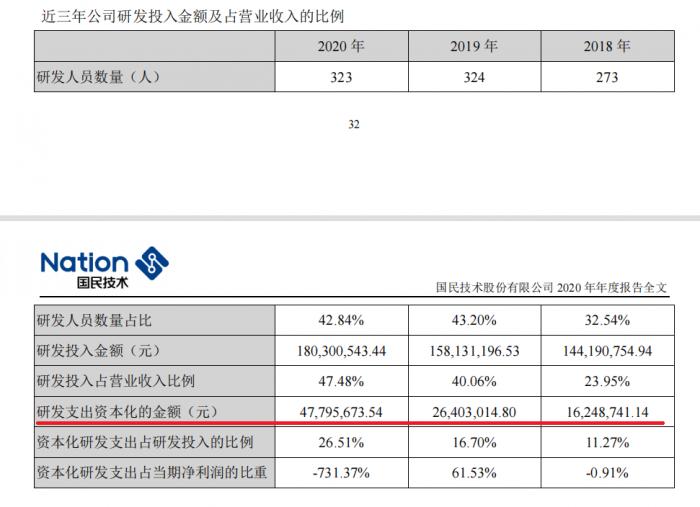 从国民技术的研发投入来看,该公司的确在过去三年里加大了研发投入,从2018年的1.44亿元到2020年的1.80亿元。而且研发投入占营业收入的比例越来越高,从2018年的23.95%到2020年的47.48%。不过,该公司研发支出资本化的金额也在逐年增加,从2018年的0.16亿元到2020年的0.48亿元;研发资本化支出占研发投入的比例也在逐年增长,从2018年的11.27%到2020年的26.51%。
