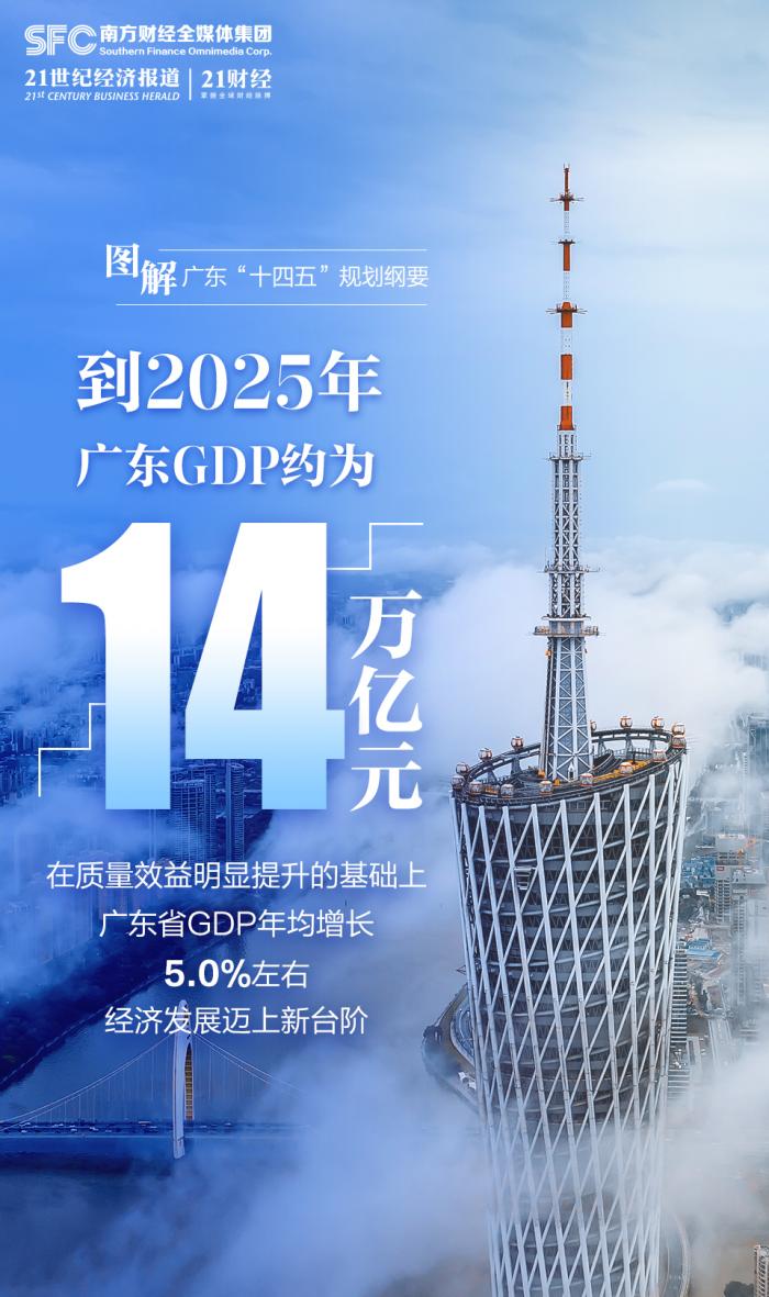 4月25日,广东发布《广东省国民经济和社会发展第十四个五年规划和2035年远景目标纲要》,提到“十四五”期间广东GDP年均增速预计达5%左右,2025年GDP达到14万亿元。