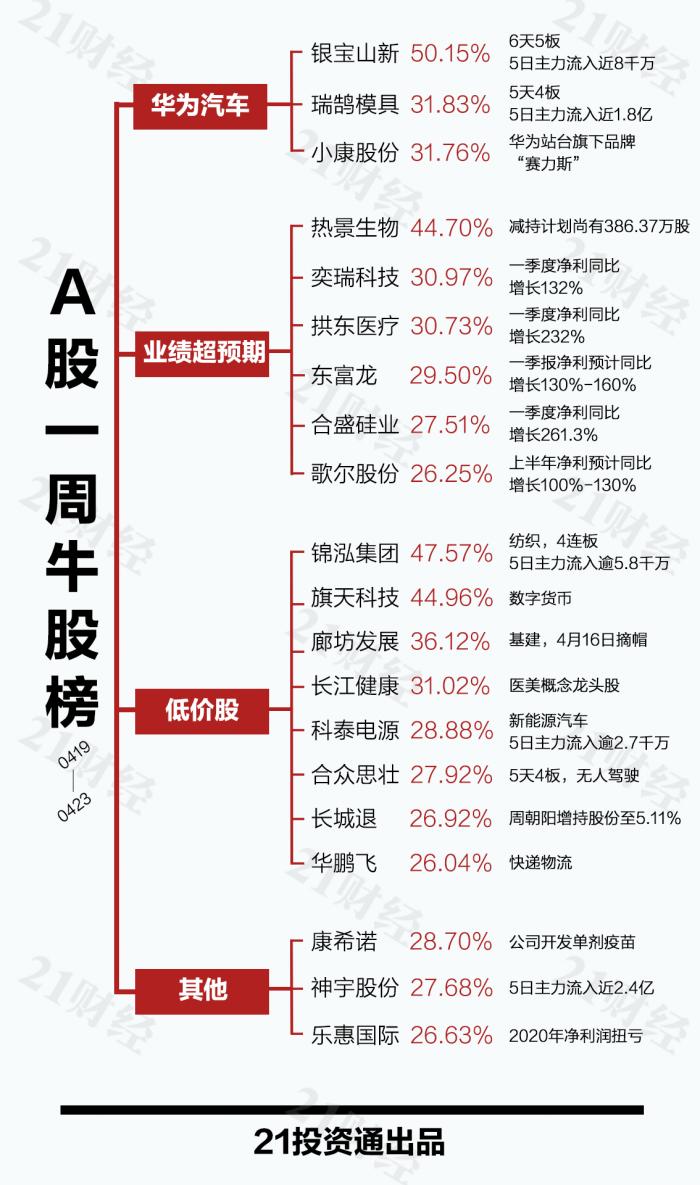 纵观20大牛股,除因华为造车消息而拉升的相关概念个股外,业绩超预期及低价股成为本期牛股榜的另两大亮点。正值一季报披露期,奕瑞科技(688301.SH)、拱东医疗(605369.SH)、东富龙(300171.SZ)、合盛硅业(603260.SH)等个股一季报业绩喜人,净利润均同比增长100%以上。另外,当周市场资金流入低价股,锦泓集团(603518.SH)、旗天科技(300061.SZ)、廊坊发展(600149.SH)等个股周涨幅均超25%。