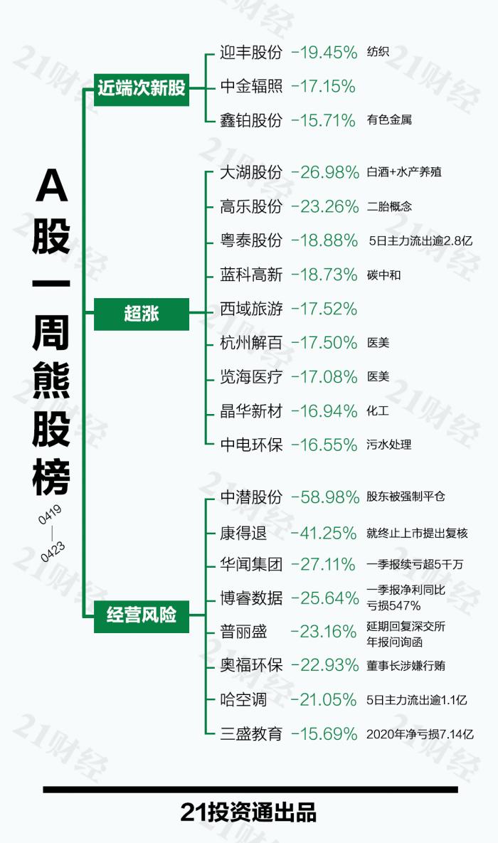 此前曾一年暴涨17倍的妖股中潜股份(300526.SZ)当周暴跌58.98%,领跌本期熊股榜,“幕后推手”主要是利空消息频出。4月20日,中潜股份公告延期披露《2020年度报告》,而此前公布的年报预告显示至少亏损1.2亿元;1天后,持股9.07%的股东刘勇拟被强制平仓,被动减持不超4%公司股份。