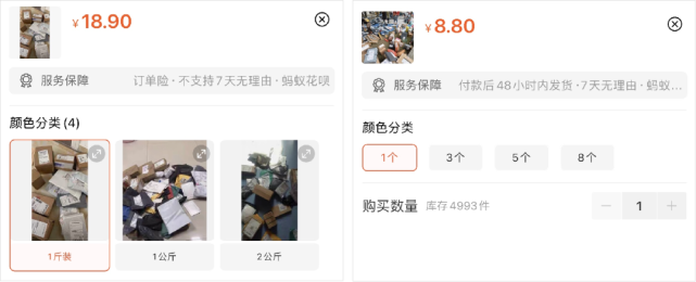 这些快递盲盒的价格总体来说很便宜,按个卖的,一个包裹只要个位数块钱;甚至还有按斤卖的,十几块钱就能买到一斤“快递盲盒”,简直跟白捡差不多: