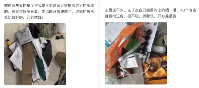 相比市面上的「潮玩盲盒」,这些「快递盲盒」不仅售价更低,而且内容物也更丰富,因此不少人都买了又买,就为了获得“拆快递”式的快感。