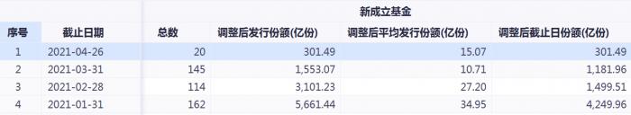 统计数据显示,按照基金成立日期统计,截至4月26日,4月以来市场上新发基金数量为20只,合计发行规模301.49亿元,而在今年1月、2月、3月,分别有162只、114只、145只新基金成立,发行规模分别达5661.44亿元、3101.23亿元、1553.07亿元,呈现逐月减少的趋势,且下降趋势明显。