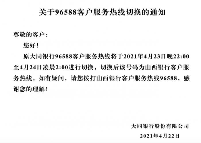 与此同时,晋城银行、大同银行还发布了对客服热线升级的通知,其中大同银行的通知显示:切换后该号码为山西银行客户热线。如有疑问,请您拨打山西银行客服服务热线96588。