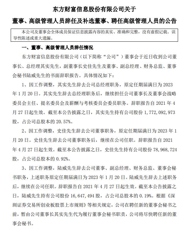 4月26日,东方财富发布公告,公司董事会于近日收到公司董事长、总经理其实,副董事长史佳及董事、副总经理、财务总监、董事会秘书陆威的书面辞职报告。